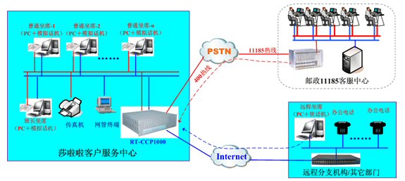 在本次項(xiàng)目中,莎啦啦計(jì)劃前期部署一個(gè)E1中繼,20路人工坐席,并且提供全國(guó)統(tǒng)一的400-710-6600服務(wù)熱線(xiàn),融天的RT-CCP1000平臺(tái)再次以一體化和IP接入兩大特點(diǎn)獲得用戶(hù)的最終認(rèn)可,系統(tǒng)網(wǎng)絡(luò)圖大致如下: