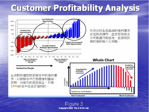 圖3右下角的鯨狀圖進一步地說明了情況:它根據(jù)客戶分配成本,而更清楚地看到客戶收益性。行動成本計算或ABC可以使確保您的業(yè)務實現(xiàn)贏利的關鍵成本更清楚易懂。讓我們看一個例子,來比較兩種獲得和保持手機用戶的不同的方法。你將看到該高水平分析法可以很充分地使對呼叫中心利潤的基本要素有更深的理解。