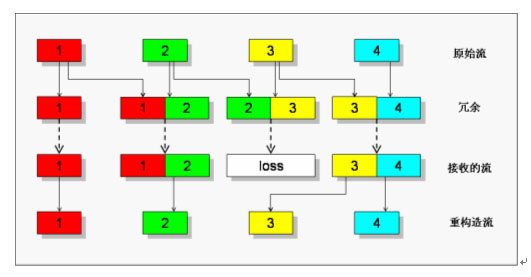 當(dāng)?shù)?個(gè)包在傳輸過程中丟失時(shí),由于包“3”被冗余編碼到第4個(gè)傳輸包中,在對(duì)端接收到碼流后還可以正常重構(gòu)出包“3”。