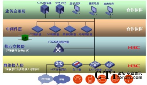 H3C公司采用標(biāo)準(zhǔn)的IP語音SIP協(xié)議,基于VCX純IP語音通信平臺(tái),與合作伙伴產(chǎn)品集成,為客戶提供新一代純IP呼叫中心解決方案;诩僆P的語音通信平臺(tái),客戶可以快速實(shí)現(xiàn)呼叫中心系統(tǒng)的部署,并且方便實(shí)現(xiàn)遠(yuǎn)程坐席、虛擬坐席的實(shí)施方案;實(shí)現(xiàn)多種媒體通信方式,如采用郵件、傳真、即時(shí)通信、WEB等方式快速建立客戶和企業(yè)之間的溝通橋梁,提高呼叫中心坐席處理客戶業(yè)務(wù)的效率;更重要的是,基于SIP協(xié)議優(yōu)秀的開放特性,IP呼叫中心能夠快速實(shí)現(xiàn)同各種語音增值應(yīng)用的集成,更好的將IP語音通信技術(shù)應(yīng)用到呼叫中心的系統(tǒng)服務(wù)中來。