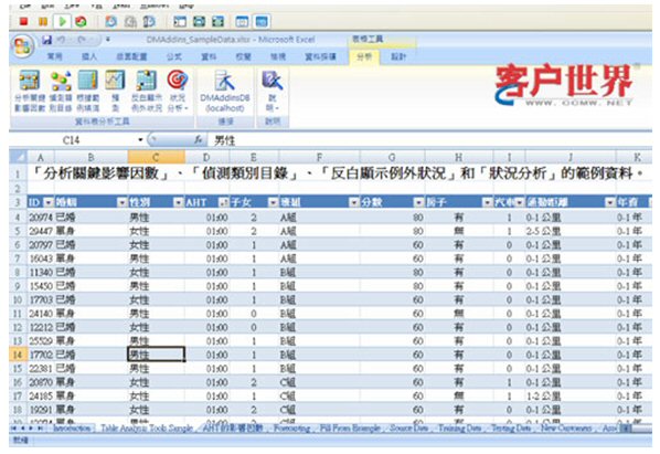 前面談到的Excel功能,都是在Excel 2003可以輕易實現(xiàn)的,但在Excel 2007,有了一個重大的突破,就是提供了一系列的數(shù)據(jù)挖掘工具。微軟把本來屬于非常高深的數(shù)據(jù)挖掘功能,做到了Excel里面,最棒的是,你完全不必懂?dāng)?shù)據(jù)挖掘,也不必懂類似MS SQL這種讓人一聽就頭昏的數(shù)據(jù)庫管理。