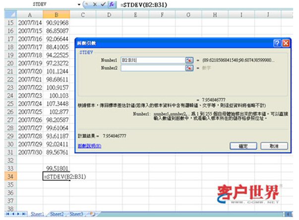 標(biāo)準(zhǔn)差是最小方差管理法高度依賴的指標(biāo),計算方法很簡單,在EXCEL里面,只要利用“STDEV”函數(shù),選中你要計算標(biāo)準(zhǔn)差的數(shù)列,如下圖,我們要計算7月1號到30號平均處理時長的標(biāo)準(zhǔn)差,7月1號到30號平均處理時長的數(shù)據(jù),就是B2到B31這數(shù)列,只要選中這數(shù)列,按“確定”,就會得出標(biāo)準(zhǔn)差。