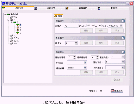 在局域網(wǎng)內(nèi)的任何一臺(tái)客戶機(jī)上,系統(tǒng)管理員通過客戶端控制程序訪問主機(jī)系統(tǒng)設(shè)置數(shù)據(jù)庫(kù),具有系統(tǒng)管理員權(quán)限的客戶帳戶均可登錄進(jìn)入AllContral系統(tǒng)控制臺(tái)程序。通過這個(gè)基于客戶端的程序,系統(tǒng)管理員可完成PABX設(shè)置、ACD設(shè)置、IVR設(shè)置等許多系統(tǒng)管理和配置工作。