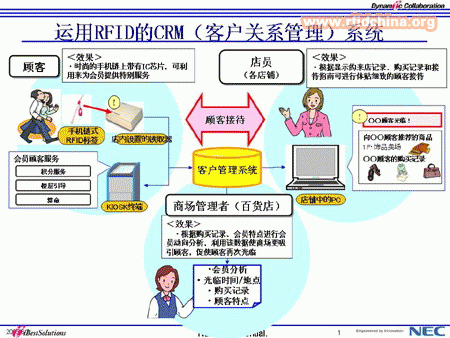 上海婦女用品商店B館是中國(guó)最大的零售集團(tuán)—百聯(lián)集團(tuán)下屬的一家婦女時(shí)裝商店。 該館在全面裝修時(shí),引進(jìn)了運(yùn)用電子標(biāo)簽(RFID) 技術(shù)的先進(jìn)的客戶關(guān)系管理(CRM)系統(tǒng)。這套客戶關(guān)系管理(CRM)系統(tǒng)中集結(jié)了眾多合作企業(yè)的技術(shù)及經(jīng)驗(yàn)精髓,采用了建立在個(gè)性心理學(xué)基礎(chǔ)上的一對(duì)一的營(yíng)銷手段,能幫助百貨公司提高吸引顧客的能力及銷售量,為各家百貨公司普遍看好。今后隨著該系統(tǒng)的陸續(xù)展開與推進(jìn),將成為從上海到全中國(guó)、日本,以至面向全球的一體化的解決方案。