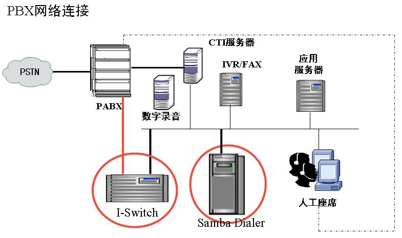 Samba Dialer和潤迅通信哈里斯數(shù)字程控交換機利用ISDN PRI進行匯接,共享現(xiàn)有話機,大大保護了投資。Samba Dialer直接通過PRI進行信令檢測,不依賴程控交換機的CTI功能,這樣可以避免大量外撥電話對CTI資源的占用而影響呼入業(yè)務(wù)的運作。另外,交換機的CTI接口一般不具備很高的穩(wěn)定性,Samba Dialer脫離CTI獨立運行,也使自身不受CTI可靠性的影響。