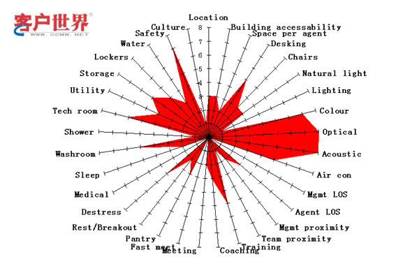 在“環(huán)境”類(lèi)別之下,包括了與座席代表身心健康、工作便利性和管理有效性有關(guān),體現(xiàn)呼叫中心物理特征的30多個(gè)子項(xiàng)。圖三顯示的就是某個(gè)假想呼叫中心的環(huán)境星狀圖。