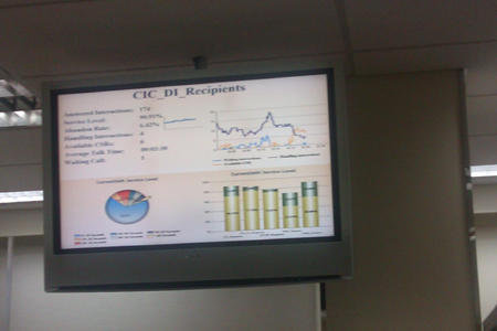 呼叫中心在三樓,在這里有先進(jìn)的軟件系統(tǒng)監(jiān)測出電話呼入、呼出量、棄線率、平均通話時長等各類信息并在電視屏幕上實(shí)時顯示。據(jù)索尼(中國)顧客互動中心負(fù)責(zé)人介紹,這是采用的COPC管理體系。