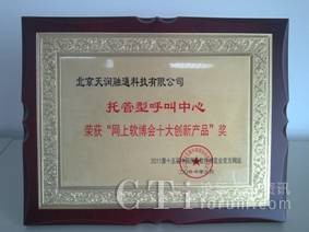 為了樹(shù)立軟件行業(yè)創(chuàng)新業(yè)務(wù)的典范,分享不同企業(yè)的軟件發(fā)展成果,本次大會(huì)通過(guò)官網(wǎng)的產(chǎn)品展示,用戶體驗(yàn)投票和軟博會(huì)專(zhuān)家顧問(wèn)團(tuán)評(píng)選的方式,評(píng)選出了的“軟博會(huì)十大創(chuàng)新產(chǎn)品”獎(jiǎng)。北京天潤(rùn)融通科技有限公司的“托管型呼叫中心服務(wù)”,以其在呼叫中心鄰域內(nèi)創(chuàng)新的saas業(yè)務(wù)模式,簡(jiǎn)單、易用、可依靠的服務(wù)特色,獲此殊榮。