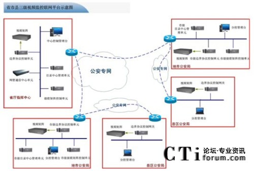 在省廳到地市之間配置視頻監(jiān)控聯(lián)網平臺中的核心管理調度單元、專用視頻終端、CS中心GIS控制客戶終端、邊界標準協(xié)議控制單元,地市核心管理調度單元、級聯(lián)矩陣控制中心單元、網管通信中心單元、中心音頻ACU調度單元、邊界標準協(xié)議控制網關、CS中心GIS控制客戶終端、通用型數字矩陣解碼陣列、通用標準控制矩陣鍵盤等組件構建省至地市級公安監(jiān)控聯(lián)網系統(tǒng)。