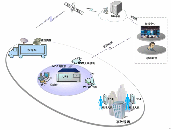 MDS調(diào)度機(jī)通過衛(wèi)星道與政府的NGN平臺(tái)對(duì)接,實(shí)現(xiàn)與整個(gè)城市的通信系統(tǒng)對(duì)接;并通過GSM、CDMA備份線路,實(shí)現(xiàn)多通信通道的實(shí)時(shí)切換,選擇最好的路由進(jìn)行通信。MDS調(diào)度機(jī)負(fù)責(zé)語音通訊、調(diào)度作業(yè)和指令消息轉(zhuǎn)發(fā);應(yīng)急指揮車配備調(diào)度機(jī)、調(diào)度臺(tái)、移動(dòng)調(diào)度終端、衛(wèi)星接收設(shè)備、監(jiān)控視頻設(shè)備及其他設(shè)備。所有的調(diào)度語音終端都可與MDS調(diào)度系統(tǒng)對(duì)接,實(shí)現(xiàn)調(diào)度功能及與其他的通信終端進(jìn)行通信。