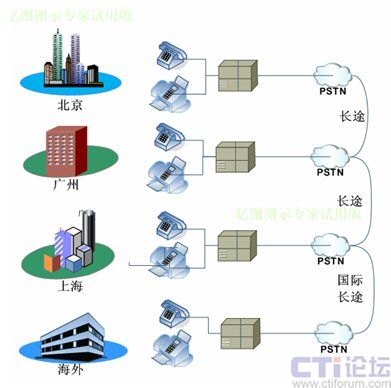 各分支機構租用獨立的電話號碼并接入當地PSTN,在這種架構下,各地之間通話就會產生長途費用,并占用電話線路,但如果使用IP