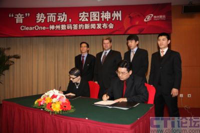2009年3月10日,國內(nèi)最大的整合IT服務提供商神州數(shù)碼和國際領先的高端音頻會議系統(tǒng)供應商ClearOne在京簽約,共同拓展國內(nèi)音頻會議系統(tǒng)市場,依托ClearOne的技術(shù)、產(chǎn)品、行業(yè)優(yōu)勢和神州數(shù)碼強大的市場號召力及運維能力,開創(chuàng)國內(nèi)音頻會議系統(tǒng)領域全新格局,為企業(yè)、教育、培訓、醫(yī)療及政府等行業(yè)客戶帶來全新震撼體驗!