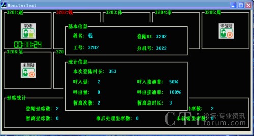 通過坐席監(jiān)控程序,呼叫中心管理人員可以實時監(jiān)控座席的登錄時間、當(dāng)前狀態(tài)(空閑、忙于外線或內(nèi)線、正在振鈴、免打擾、限制時間、報警、退出等)、當(dāng)前狀態(tài)的起始時間、持續(xù)時間、與誰連接等,從而實現(xiàn)簡單明了的質(zhì)檢功能。我們實現(xiàn)了兩種坐席監(jiān)控:C/S模式和B/S模式。
