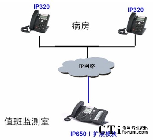 SoundPoint IP320。監(jiān)控室的值班醫(yī)生需要和患者溝通時(shí),只需按IP650上病房相應(yīng)的快速撥號(hào)鍵,一鍵快速的呼叫病房的IP320。病房的患者也可以摘機(jī)或按免提鍵自動(dòng)呼叫監(jiān)測室的IP650,和值班醫(yī)生進(jìn)行溝通。當(dāng)值班醫(yī)生和患者通話時(shí),其它患者的電話呼叫監(jiān)測室,值班醫(yī)生可以看到是哪個(gè)病房呼叫的,可以馬上接聽,也可以結(jié)束當(dāng)前通話后根據(jù)通話記錄回呼患者進(jìn)行溝通。