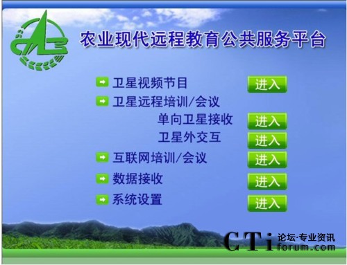 會(huì)議所使用的農(nóng)業(yè)現(xiàn)代遠(yuǎn)程教育平臺(tái)將先進(jìn)的多媒體寬帶DVB衛(wèi)星通信系統(tǒng)和全面的網(wǎng)絡(luò)遠(yuǎn)程教育培訓(xùn)/會(huì)議系統(tǒng),天(衛(wèi)星網(wǎng))地(互聯(lián)網(wǎng))合一,集成廣播、電視和網(wǎng)絡(luò)的功能,形成了廣覆蓋、大容量、多功能、低成本、快捷高效的遠(yuǎn)程教育培訓(xùn)網(wǎng)絡(luò)、技術(shù)培訓(xùn)資源傳輸通道和網(wǎng)絡(luò)視頻會(huì)議系統(tǒng),是面向“三農(nóng)”開展多形式多層次現(xiàn)代遠(yuǎn)程教育培訓(xùn)、科學(xué)普及、技術(shù)推廣和信息傳播的公共服務(wù)平臺(tái)。該平臺(tái)包括:?jiǎn)蜗驈V播式衛(wèi)星直播系統(tǒng)、雙向衛(wèi)星交互式培訓(xùn)/會(huì)議系統(tǒng)、衛(wèi)星外交互培訓(xùn)/會(huì)議系統(tǒng)(衛(wèi)星接收,互聯(lián)網(wǎng)回傳)和地面互聯(lián)網(wǎng)雙向交互培訓(xùn)/會(huì)議系統(tǒng),適用于純衛(wèi)星網(wǎng)絡(luò)和衛(wèi)星網(wǎng)、互聯(lián)網(wǎng)混合接入等各種網(wǎng)絡(luò)環(huán)境。