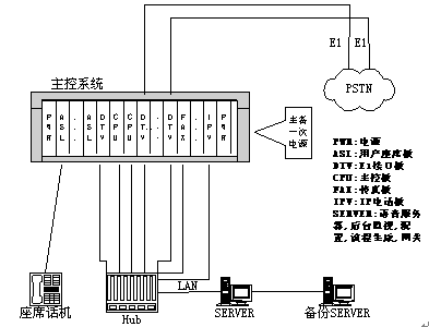 1、 基于數(shù)字程控交換技術(shù),主控系統(tǒng)通過(guò)LAN與SERVER交互語(yǔ)音與傳真數(shù)據(jù);