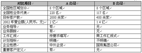 在最近一次對照了兩家同具有全國性區(qū)域推廣業(yè)務(wù)的公司之后,我們發(fā)現(xiàn),精細營銷為企業(yè)帶來的效益是顯著的。我們以A公司表示采用了精細營銷,B公司未采用精細營銷,表1反映兩家公司的主要數(shù)據(jù)對照: