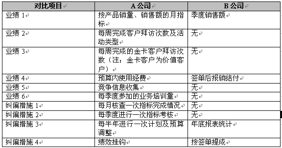 顯然,兩家公司在經(jīng)營業(yè)績和人員規(guī)模上有差不多的基礎(chǔ),但兩家所處的行業(yè)和性質(zhì)有明顯不同,如何評估兩家企業(yè)精細營銷的管理效益呢?我們再以表2反映兩家公司對業(yè)務(wù)代表工作指標及糾偏: