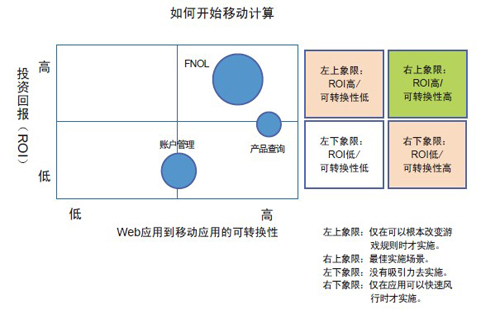 建議考察兩個基本維度:(1)第一個移動項目的總投資回報(ROI)和價值主張是什么?(2)現(xiàn)有的Web應(yīng)用如何通過相對較少的努力就可以轉(zhuǎn)變成移動應(yīng)用?在下面的圖表中這兩個維度被標(biāo)為X軸和Y軸。氣泡的大小代表投入的大小。很顯然,右上方的象限是容易摘取的果子。您選擇哪個氣泡關(guān)鍵在于您對風(fēng)險的偏好以及在市場中成為領(lǐng)先者的渴望。