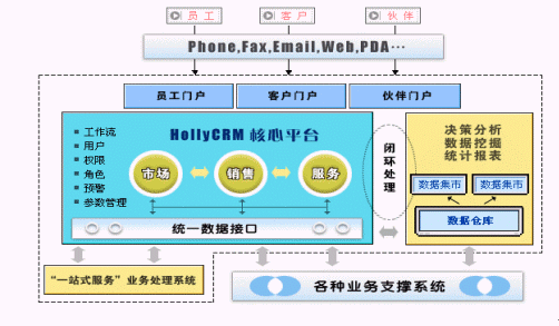HollyCRM通過EAI與企業(yè)原有的業(yè)務系統(tǒng)充分整合,有效解決了阻礙企業(yè)內部信息良性流轉的"信息孤島"現(xiàn)象。HollyCRM將分析型CRM產生的客戶價值和經營分析結果實時反饋到運營型CRM中,通過協(xié)作型CRM提供的接觸渠道,針對不同客戶提供個性化的營銷、銷售和服務活動。HollyCRM實現(xiàn)了整個企業(yè)信息的閉環(huán)、良性循環(huán)。