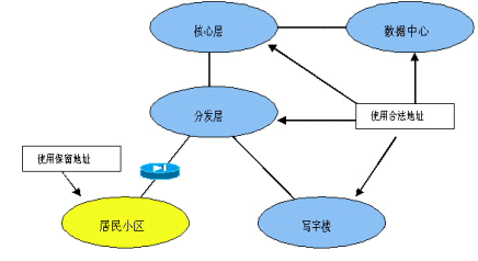 考慮IP地址資源有限,因此,居民小區(qū)接入用戶量大,地址使用效率低,因此在居民小區(qū)部分采用RFC 1519規(guī)定的保留地址,建議采用10.0.0.0。在每個小區(qū)的出口處配備地址轉換設備,實現(xiàn)保留地址和合法地址之間的轉換。