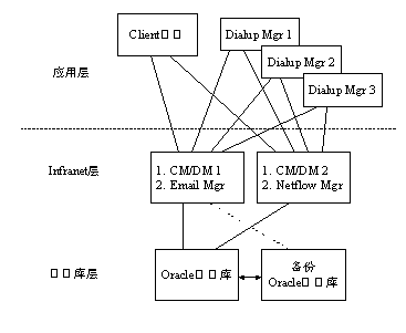 硬件平臺呈3層結構,分別為應用層、Infranet計費和用戶管理層以及數(shù)據(jù)庫層。