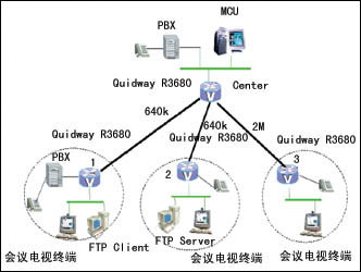 對于視頻的互通,則采用專用的視頻網(wǎng)關(guān),在中心處配置一臺MCU作為整個網(wǎng)絡(luò)視頻系統(tǒng)的管理者,1、2、3節(jié)點(diǎn)則配置具有視頻網(wǎng)關(guān)功能的視頻終端。在網(wǎng)上召開視頻會議時,各會場的加入和畫面的調(diào)度都由位于中心的MCU進(jìn)行控制。通過視頻網(wǎng)關(guān)壓縮的圖像的帶寬為512kbps。