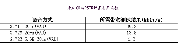 為進(jìn)一步節(jié)省帶寬,又采用語音激活檢測技術(shù)(VAD)及舒適噪音生成(CNG)技術(shù),VAD技術(shù)只有當(dāng)檢測到語音處于活動(dòng)狀態(tài)時(shí),編碼器的輸出信號(hào)才被送到網(wǎng)絡(luò)上,因此節(jié)省了帶寬。而在靜音時(shí)段采用CNG技術(shù),生成與背景噪聲相匹配的較舒適的靜音,避免了用戶有不自然的交談感覺,保證通話質(zhì)量。實(shí)際測試結(jié)果如表4,采用G.72920ms打包+VAD技術(shù)節(jié)省了近75%的帶寬。