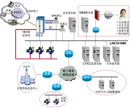 針對(duì)政府目前熱線電話眾多,管理不規(guī)范,資源無(wú)法共享的問(wèn)題,華為公司提出的基于資源整合理念的解決方案,采用華為公司呼叫中心技術(shù)構(gòu)建完整的計(jì)算機(jī)電信集成(CTI)系統(tǒng)體系,并充分利用政府現(xiàn)有的信息網(wǎng)絡(luò)資源,一方面整合原有分散的熱線,啟用12345政府熱線號(hào)碼統(tǒng)一接入;另一方面將自動(dòng)語(yǔ)音查詢、人工服務(wù)、信息資料處理緊密結(jié)合起來(lái),依托地方政府各類業(yè)務(wù)技術(shù)支持系統(tǒng)和網(wǎng)絡(luò)系統(tǒng),建立一套通暢的來(lái)電業(yè)務(wù)公文流轉(zhuǎn)系統(tǒng),通過(guò)人工受理或自動(dòng)語(yǔ)音服務(wù)等方式,為人民群眾提供全天候24小時(shí)不間斷的服務(wù)。最終整合現(xiàn)有的全部政府部門政府熱線資源,使政府政府熱線服務(wù)范圍覆蓋到政府公共服務(wù)的全部領(lǐng)域,為市民提供全方位、全天候、高效率的政府政府熱線服務(wù),市民只記一個(gè)電話號(hào)碼,只打一次電話,就能得到政府答復(fù)和服務(wù)。