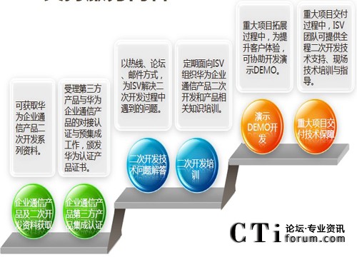 華為企業(yè)通信ISV技術(shù)支持團隊成立亍2008年1月,開放了論壇、郵件和電話三種求劣咨詢渠道,為ISV廠商提供二次開發(fā)技術(shù)支持,幵定期在網(wǎng)站和論壇發(fā)布二次開發(fā)的Demo和經(jīng)驗案例。