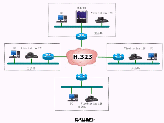 結(jié)合遼寧省消防網(wǎng)絡,本方案設(shè)計的視頻會議系統(tǒng)承載在遼寧省消防局的IP網(wǎng)絡平臺上,采用國際流行的ITU H.323通信標準。系統(tǒng)采用以MCU為中心輻射各個會場電視會議終端的星型網(wǎng)絡結(jié)構(gòu)。整套系統(tǒng)由16個會場組成,采用美國Polycom公司的ViewStation 128會議室型終端設(shè)備。網(wǎng)管中心安放一臺Polycom 公司的MGC-50(多點會議控制單元),用于對全網(wǎng)終端的控制,實現(xiàn)多點、點對點的會議。