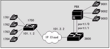 在該案例中,分部辦公室放置IP地址為10.1.1.2的DCR 1750路由器(插有二塊兩端口的FXS語音卡),總部辦公室放置IP地址為10.1.2.2的DCR 3660路由器(插有一塊兩端口的FXO語音卡),通過正確的規(guī)劃和配置可以實現(xiàn)銷售部辦公室和總部辦公室之間的IP語音連接。DCR 3660路由器是到達總部辦公室的主網(wǎng)點,它需要連接到公司的PBX上,當然,在分布也可以直接使用FXO語音卡和PBX直接連接,這樣在分部與總部之間可以通過IP網(wǎng)絡來撥打0話費的長途電話。