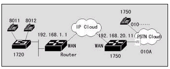 該案例中,連接到位于上海的的用戶,可以通過IP網(wǎng)絡撥打北京的PSTN用戶。位于北京的DCR 1750路由器通過 FXO接口直接連接到PSTN。假設北京可能的用戶在PSTN上的電話號碼為8位,北京的區(qū)號為010。上海的DCR 1720使用FXS端口與電話相連,北京的DCR 1750路由器使用FXO端口與PSTN上的電話端口相接,假設此端口在PSTN上的號碼為A。那么上海的用戶可以使用圖中號碼為8011(8012)的電話直接撥北京的任意電話,而北京的PSTN用戶呼叫8011(8012)電話,必須先撥號碼A,聽到二次撥號音時撥8011(8012)。在實現(xiàn)時,上海的DCR 1720也可以通過器語音端口連接到PSTN,通過二次撥號,使得兩地的PSTN用戶可以通過IP網(wǎng)絡互相通話,而話費只是市話的費用。