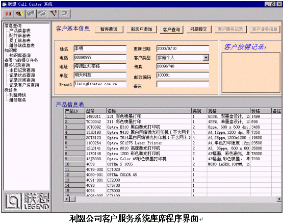 聯(lián)想神州數(shù)碼電子商務(wù)部于2000年7月承建利盟中國公司客戶服務(wù)中心系統(tǒng),該客戶服務(wù)系統(tǒng)可以為利盟全國的用戶提供產(chǎn)品、信息、價格、咨詢等服務(wù);服務(wù)方式包括人工、語音、傳真、郵件等。