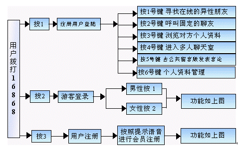 系統(tǒng)用戶可以通過(guò)撥打固定電話、小靈通實(shí)現(xiàn)語(yǔ)音聊天交流;可以通過(guò)系統(tǒng)服務(wù)收聽聊友給自己的留言;給任何聊友留言;參與主題聊天;通過(guò)聊友速配與聊友聊天;系統(tǒng)還提供查詢、幫助功能,以方便用戶更好的使用系統(tǒng)業(yè)務(wù)。
