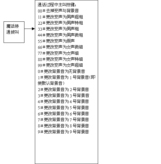 變聲通話功能也叫魔話功能,是指用戶通過通過播打特殊的號碼接入到本平臺后,再通過本平臺去呼叫最終的被叫用戶,在這樣的一個通話過程中,可以通過本平臺提供8級變聲和原聲功能:"男聲超粗、男聲特粗、男聲粗、男聲微粗、原聲、女聲微細、女聲細、女聲特細、女聲超細"。在通話過程中實時變聲,并可按鍵選擇改變變聲系數(shù)或恢復(fù)原聲,趣味非凡,超常體驗。