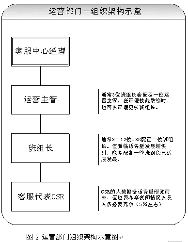 關(guān)于團(tuán)隊(duì)的建設(shè),應(yīng)該首先考慮組織架構(gòu)的設(shè)立。從運(yùn)營角度講,設(shè)置客服中心經(jīng)理、運(yùn)營主管、班組長、客服代表都是必須的。當(dāng)然根據(jù)不同的規(guī)模,也可以增加或者減少層級(jí)。具體建議請(qǐng)見圖2所示。除了運(yùn)營之外,對(duì)于大型呼叫中心(50坐席以上,或者業(yè)務(wù)較為復(fù)雜的),也應(yīng)考慮相關(guān)部門的設(shè)立。比如客戶關(guān)注組,可以負(fù)責(zé)疑難問題解決、工單流轉(zhuǎn)、投訴處理、建議處理、知識(shí)庫建設(shè)采編等等;培訓(xùn)組可以負(fù)責(zé)管理、組織、實(shí)施員工培訓(xùn);技術(shù)維護(hù)組可以負(fù)責(zé)系統(tǒng)維護(hù)、網(wǎng)絡(luò)維護(hù)、新項(xiàng)目應(yīng)用界面開發(fā)、部分系統(tǒng)優(yōu)化;綜合行政可以負(fù)責(zé)人事、行政等事務(wù)。