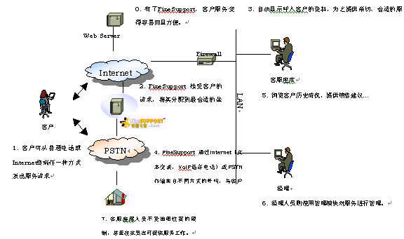 FineSupportTM網(wǎng)通呼叫中心解決方案主要由以下幾個(gè)部分組成:Media Gateway(接受來(lái)自IP網(wǎng)的網(wǎng)絡(luò)電話、傳統(tǒng)電話等呼叫,傳送給軟交換系統(tǒng))、Service Switch(軟交換系統(tǒng),負(fù)責(zé)呼叫控制)、IP IVR(存儲(chǔ)顧客呼叫信息,播放語(yǔ)音提示信息)、Soft ACD(呼叫分配服務(wù)器,可定制多種分配策略)、Web Server(負(fù)責(zé)報(bào)表管理、站點(diǎn)管理和監(jiān)控、FAQ存儲(chǔ)管理、留言及文本交談管理等)、Chat Server(建立交談通道)、Remote Agent(坐席工作站。通過(guò)客戶端軟件進(jìn)行客服支持)。