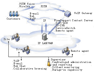 FineSupport發(fā)揮了軟交換和VoIP技術(shù)的優(yōu)勢,并融合了Internet的特性,使顧客與呼叫中心之間不僅可以通過語音進行通信,還可以通過電子郵件、傳真、文字交談進行通信,甚至可以實現(xiàn)在線推送網(wǎng)頁、在線網(wǎng)頁導(dǎo)航等業(yè)務(wù)。呼叫中心的客服人員只需具備一臺多媒體電腦和一副耳麥,即可向顧客提供完備的服務(wù)。