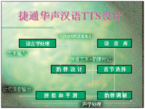 與其他文語轉換系統(tǒng)相比,捷通的TTS技術具有音庫壓縮特點,從而使TTS技術向嵌入式操作系統(tǒng)的移植(尤其是向PDA上的移植)具備先決條件。同時,捷通TTS技術在大規(guī)模真實錄音語音庫的基礎上,增加了音庫壓縮算法和音色變換算法形成核心技術,音庫大小可縮擴,小音庫為1MB,適合基于嵌入式操作系統(tǒng)的應用。