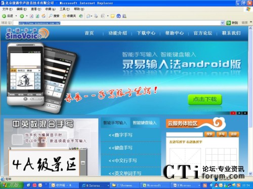 進(jìn)入首頁(yè),映入眼簾的是藍(lán)色清新的網(wǎng)站界面,用戶選擇“點(diǎn)擊下載”健,即可快速體驗(yàn)捷通華聲最新產(chǎn)品錄易輸入法Android版。捷通華聲錄易輸入法包括全屏手寫(xiě)、窗格手寫(xiě)和虛擬全鍵盤(pán)三種輸入方式,不僅識(shí)別速度快,識(shí)別率高,還可以連續(xù)書(shū)寫(xiě),豎屏疊寫(xiě),橫屏循環(huán)寫(xiě),它更貼合人們自然的輸入方式,喜愛(ài)觸屏上網(wǎng)、聊天、微博的用戶不可錯(cuò)過(guò)!