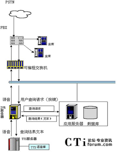 在技術上,用戶可以通過電話提交他的查詢請求(比如使用按鍵方式),IVR服務器收到請求后會向其他應用服務器提交此查詢請求,當IVR得到查詢結果后,他會將文本形式的查詢結果交給jTTS服務器,jTTS服務器會返回查詢結果的語音形式,最終語音會在坐席上播放,用戶就可以聽到他剛才所要查詢的信息。(如圖所示)