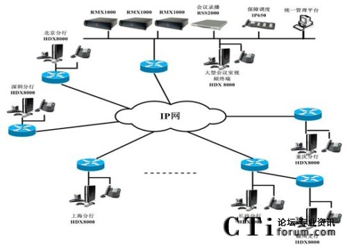 RMX1000作為多媒體多點處理單元,70臺HDX8006和HDX8002分布在全國各個分行作為視頻會議的接入,RSS2000服務器提供HD的會議錄制;65臺IP電話作為實時會議備份系統(tǒng);整個系統(tǒng)提供720P/60幀或1080P/30幀的會議畫面質(zhì)量,音頻達到22KHz寬帶音質(zhì),劇院級音質(zhì)享受,具備新一代高清雙流P on C技術。