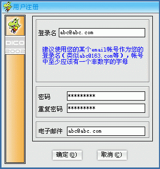 DICO下載后的安裝過程比較簡單: "接收協(xié)議"后一路"下一步"就OK了。然后是注冊,過程也委簡單:運行后,第一次使用時點"注冊"(以后使用時只要輸入用戶名或密碼登錄就是了),隨后的"用戶注冊"窗口中填寫好相關(guān)的選項后點"確定"(下圖2)就OK了!