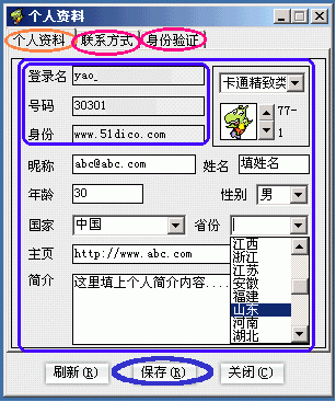 ①點按"個人資料"命令(圖3的B1處),彈出"個人資料"修改窗口,包括"個人資料/聯(lián)系方式/身份驗證"這三大類選項卡。其中:"個人資料"選項卡下,除登錄名、號碼和身份這三項不可更改外,其余各項都是可填或可選項,據(jù)你所需進行修改就是了(下圖4)。另外,還有"聯(lián)系方式"和"身份驗證"兩大選項,怎么個用法自己點開一看就明白了你!