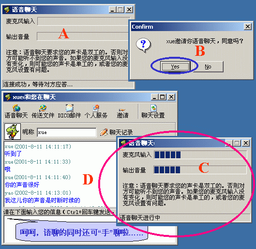在好友窗口內(nèi)單擊某"在線好友頭像"后選"語音聊天"命令(或在即時聊天窗口中點按"語音聊天"按鈕)后,主動方彈出"正等待對方應答窗口提示";而被叫方會彈出"應答與否的窗口","YES"后雙方即可聊了(下圖9)。而且,它不受防火墻的限制(下圖就是我與一個在防火墻后的朋友的聊天界面)。在這一點上,QQ就望塵莫及了!
