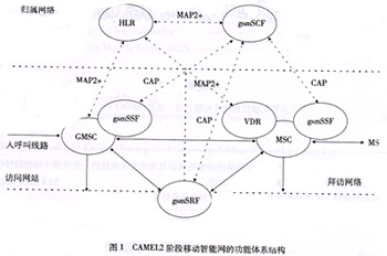 在移動通信領(lǐng)域,歐洲電信標準學(xué)會(ETSI)制定的CAMEL系列標準為基于GSM移動通信網(wǎng)絡(luò)的移動智能網(wǎng)提供了統(tǒng)一的規(guī)范。其中CAMEL2階段的標準符合ITU-T的IN CS-1,支持各種基于語音的智能業(yè)務(wù)。CAMEL2階段移動智能網(wǎng)的功能體系結(jié)構(gòu)如圖1所示。CAMEL3階段的標準基于CS-2,主要增加了對GPRS移動數(shù)據(jù)業(yè)務(wù)以及短消息業(yè)務(wù)的支持。