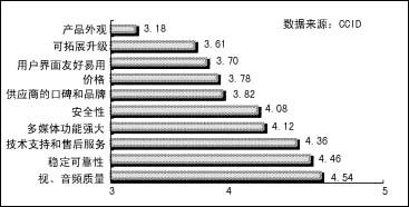 CCID對視頻會議現(xiàn)狀調(diào)查結(jié)果顯示,與以往相比,用戶對視頻會議終端系統(tǒng)的選擇標(biāo)準(zhǔn)已經(jīng)發(fā)生了變化。用戶除了一如既往地要求很好的音視頻質(zhì)量外,對產(chǎn)品的穩(wěn)定可靠性、技術(shù)支持和售后服務(wù)、多媒體功能、安全性四項也有要求。其中,用戶對視頻會議終端系統(tǒng)的多媒體功能和設(shè)備的可拓展升級提出了更高的要求,而不再局限于視音頻質(zhì)量和穩(wěn)定、可靠性上,對多媒體功能的需求在不斷地增長。更多的用戶不僅把會議系統(tǒng)用于視音頻開會,更將視頻會議的多媒體功能作為采購的重要指標(biāo)之一。