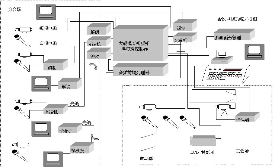 會(huì)議主機(jī)實(shí)現(xiàn)分會(huì)場(chǎng)和主會(huì)場(chǎng)的電視信號(hào)的交互切換,將各個(gè)分會(huì)場(chǎng)的電視信號(hào)送到液晶投影儀上顯示,采用液晶投影儀作大屏幕顯示在電視墻顯示方式,投資小,設(shè)有閃爍感,使主會(huì)場(chǎng)人員的視覺(jué)更舒適(參見(jiàn)系統(tǒng)圖)。