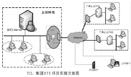 為充分發(fā)揮現(xiàn)有信息基礎(chǔ)設(shè)施和IT應(yīng)用的作用,促進(jìn)企業(yè)的實(shí)時(shí)商務(wù)運(yùn)作,節(jié)約開支,集團(tuán)公司在廣泛調(diào)查實(shí)時(shí)企業(yè)IM軟件的基礎(chǔ)上,于2002年10月對騰訊公司的RTX實(shí)時(shí)應(yīng)用軟件前身BQQ進(jìn)行了嚴(yán)格的評估和論證,認(rèn)為在如下幾個(gè)方面騰訊公司的企業(yè)IM軟件能夠解決TCL集團(tuán)公司面臨的實(shí)際問題:①業(yè)務(wù)地點(diǎn)分散,網(wǎng)絡(luò)結(jié)構(gòu)復(fù)雜;②業(yè)務(wù)復(fù)雜,無法形成集中統(tǒng)一的工作流管理系統(tǒng);③人員素質(zhì)差異性較大,復(fù)雜的IT應(yīng)用如OA系統(tǒng)等應(yīng)用推廣受到一定阻力;④集團(tuán)內(nèi)部缺乏一個(gè)公共實(shí)時(shí)交流平臺(tái),企業(yè)內(nèi)部溝通不暢;目前集團(tuán)公司內(nèi)部主要通過電話、傳真和E_mail這些傳統(tǒng)工具傳遞信息,企業(yè)的實(shí)時(shí)化大受影響。而且騰訊公司的RTX產(chǎn)品投入低,上手快,于是TCL集團(tuán)領(lǐng)導(dǎo)決定上馬RTX項(xiàng)目,自上而下推廣RTX項(xiàng)目。
